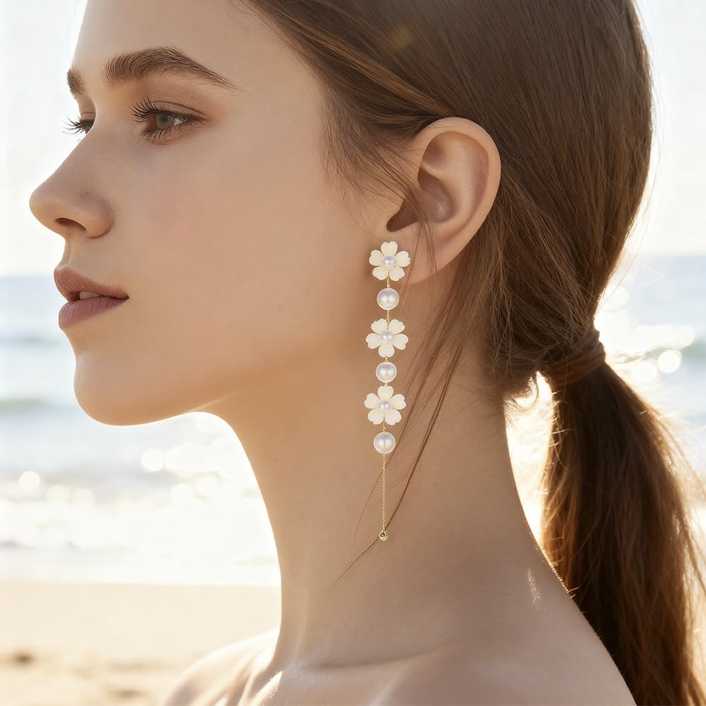 Long Pearl Flower Drop Earrings- Trendy Petal Pearl Dangle Earrings- Dainty Wedding Earrings Easy-Wear Fashion Statement Jewelry Gift For Women Brides